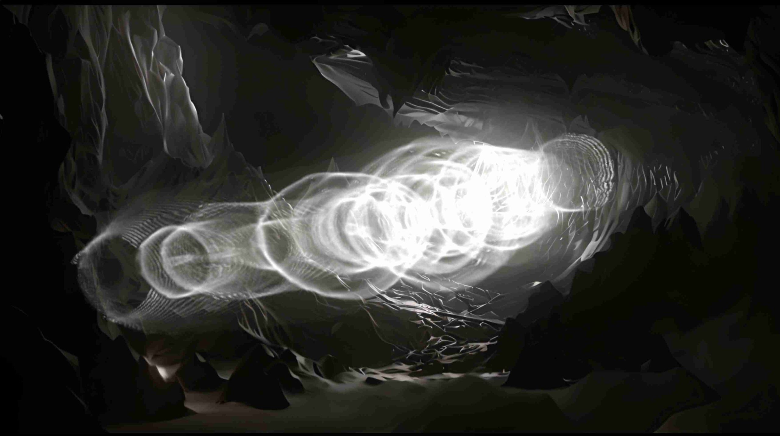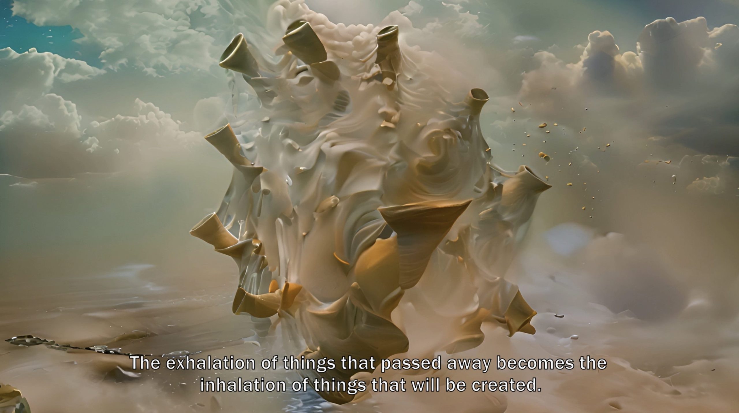 In our first experiment <Fetal Movement>, the hacked prompts allow us to indirectly experience the process of reversing our perceptions and sensory systems to perceive the world around us. We created a new alternative temporality, by combining AI-generated images, and video with 2D animation, which provides an audiovisual experience that explores the invisible world of sound mutations, their resonance, dissipation, and organic chronicle.