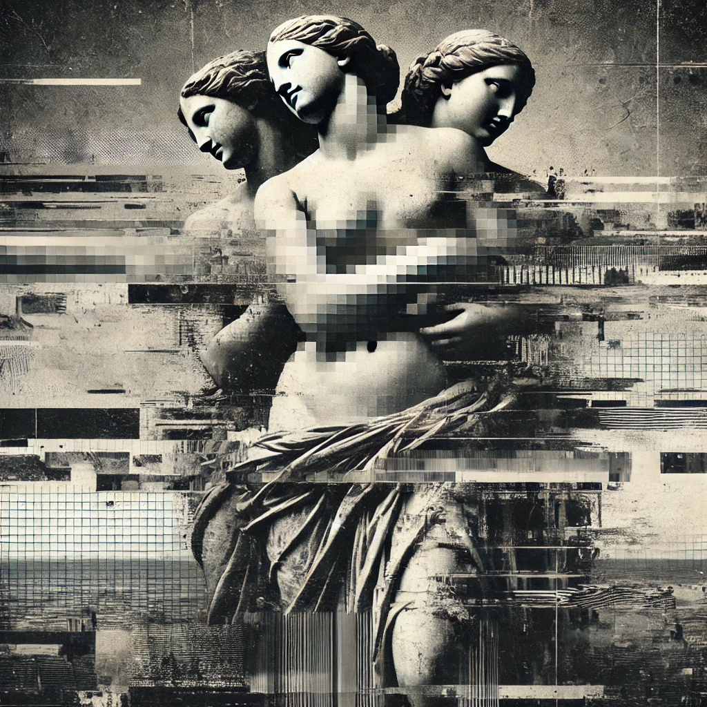 Deconstructed Relic is a striking commentary on censorship, historical reinterpretation, and the erosion of cultural memory in the digital age. The glitch elements further amplify a sense of instability, as though this classical relic is dissolving into a matrix of uncertainty. It invites reflection on modern society’s paradoxical relationship with art—simultaneously revering and censoring it.