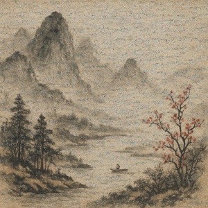 Between Mist and Glitch suspends the viewer in a dreamlike tension — where the permanence of ink meets the instability of signal. Rooted in the brushwork traditions of guó huà (国画 / 國畫), this piece evokes the serenity of ancient Chinese landscapes: mist-cloaked peaks, drifting riverboats, and the timeless hush of nature.
