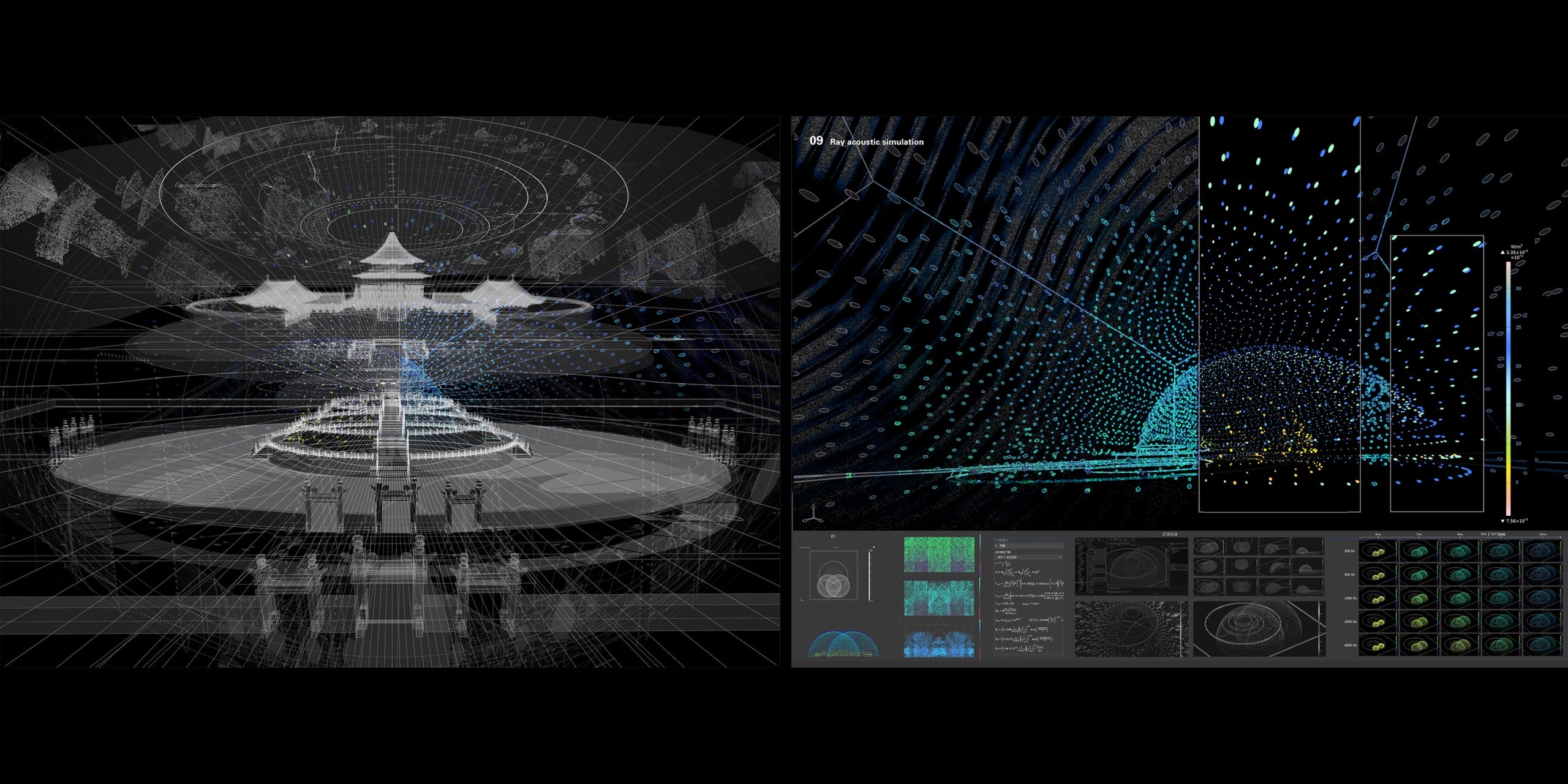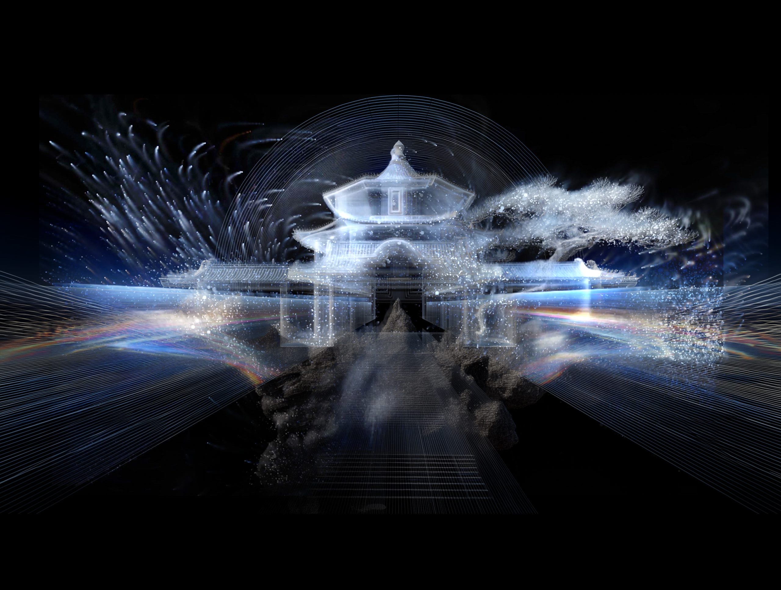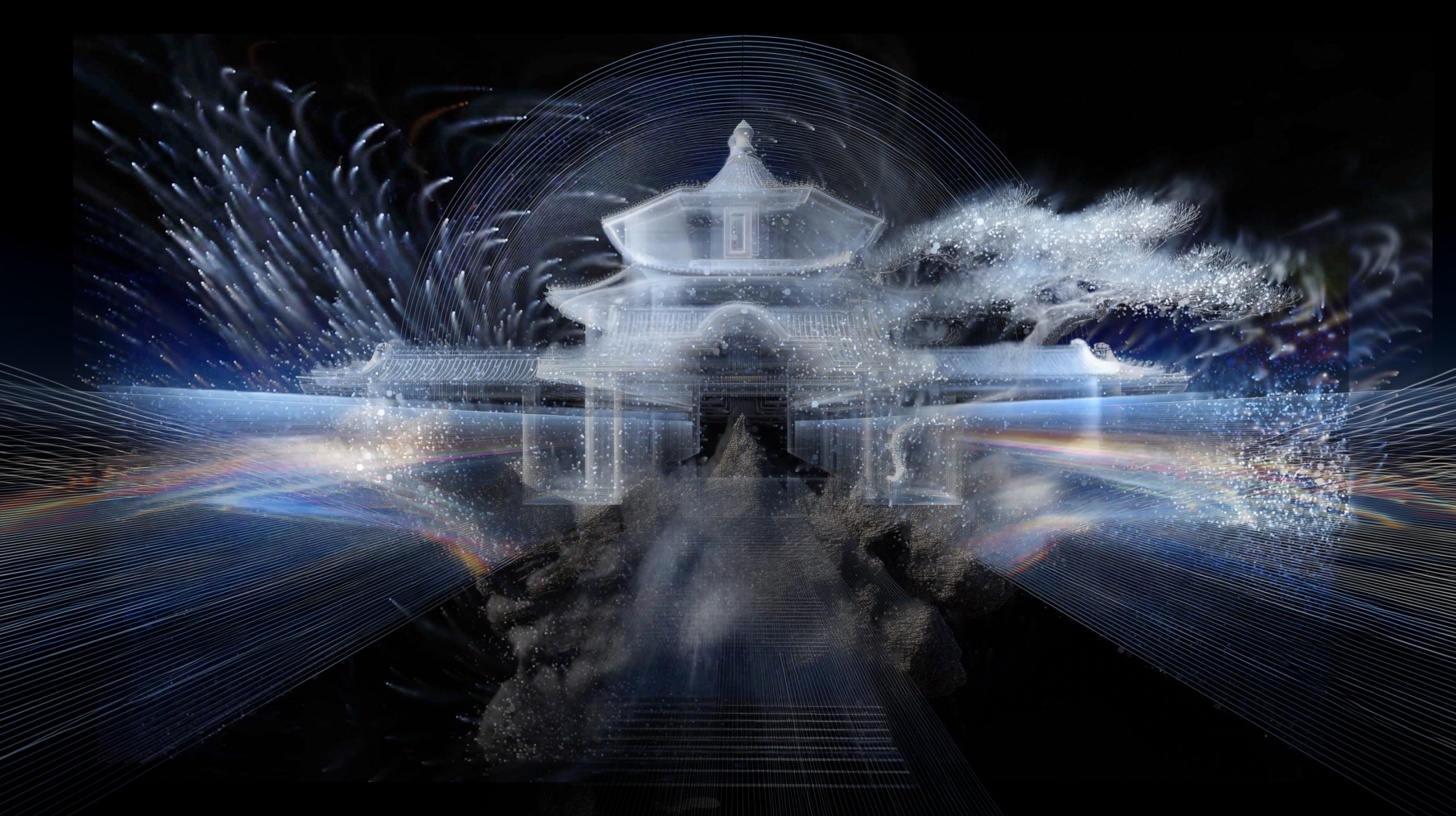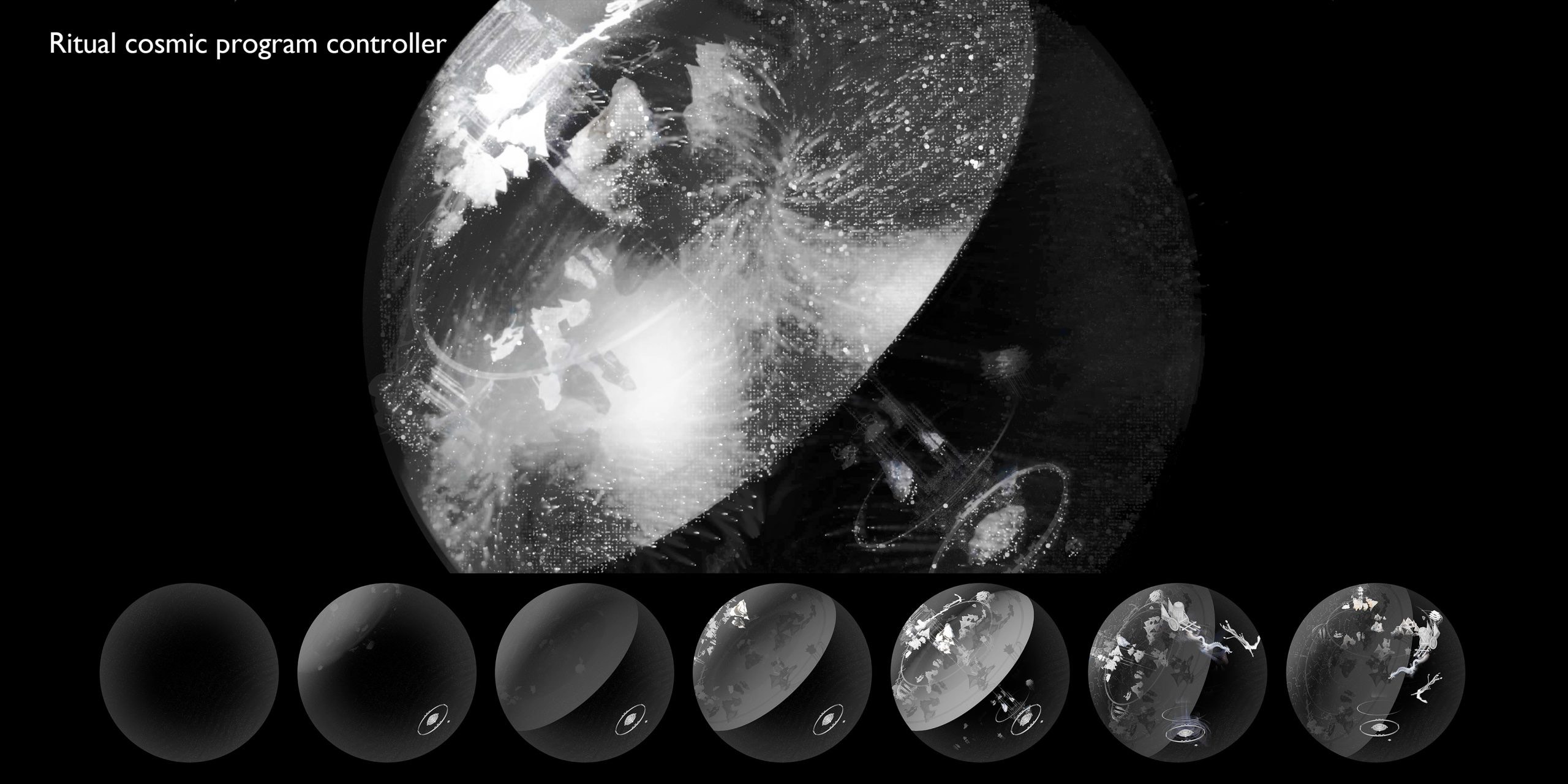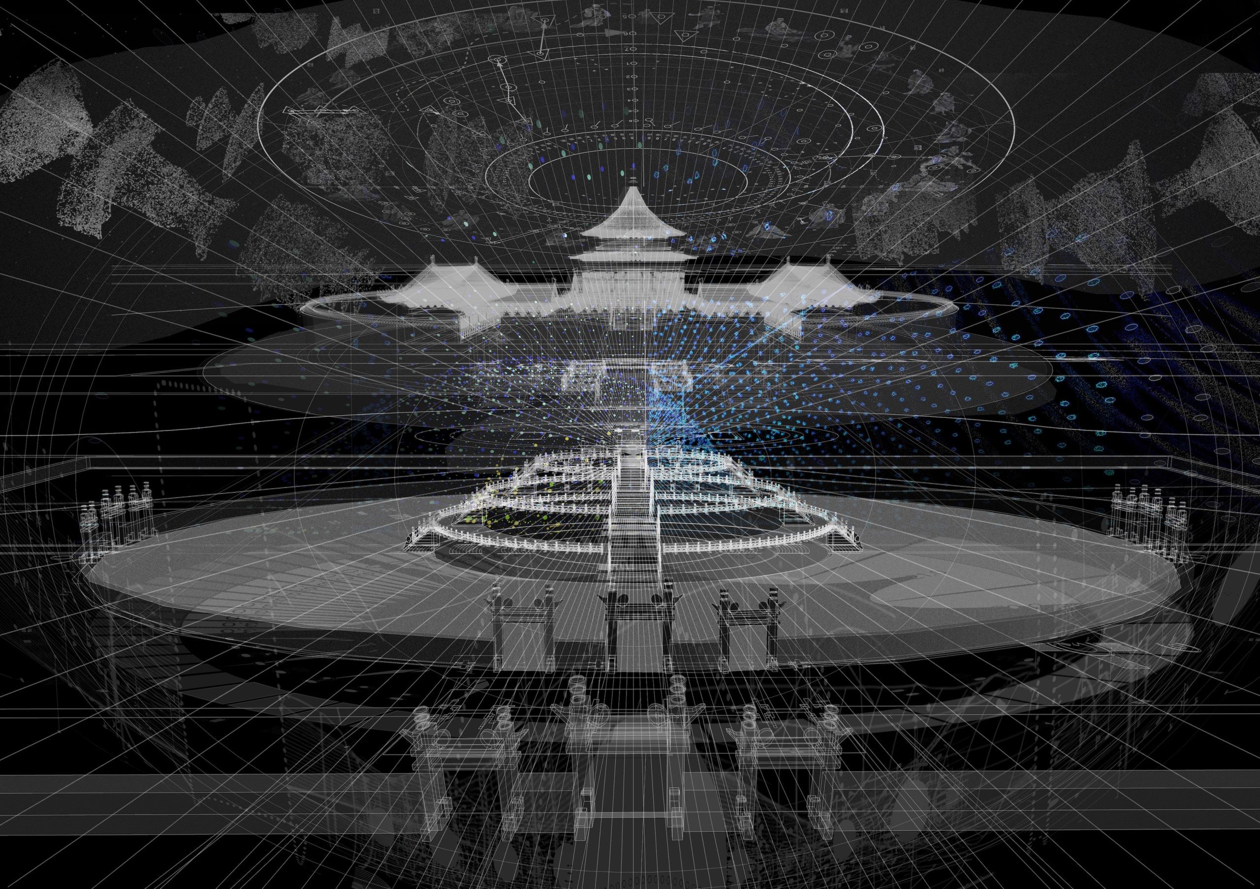 The triptych video consists of: (1) Visual archive: over a thousand layered cultural symbols evolving with ritual lyrics; (2) Ritual program controller: an interactive diagram of “sound-symbol-space” from a celestial perspective; (3) AI-generated audiovisual hallucinations: a particle system merging historical imagery and sonic fluctuations. Here, AI hallucinations are not flaws but emergent collective imaginaries—when deities and mythical beings carry multiple historical archetypes, their indeterminacy reconstructs the sacred as an unfixed epistemic threshold.