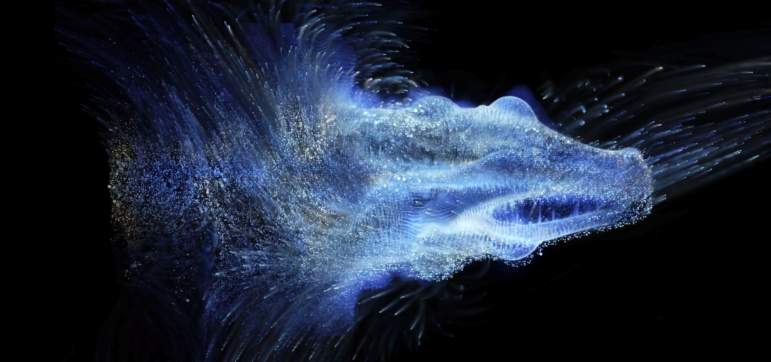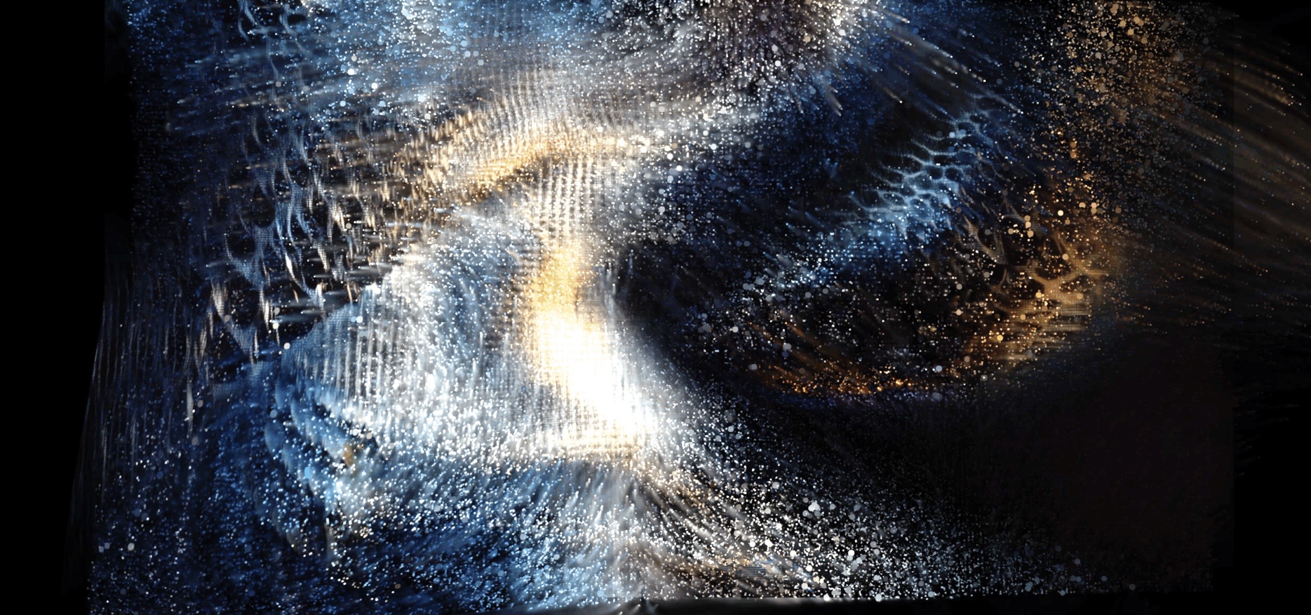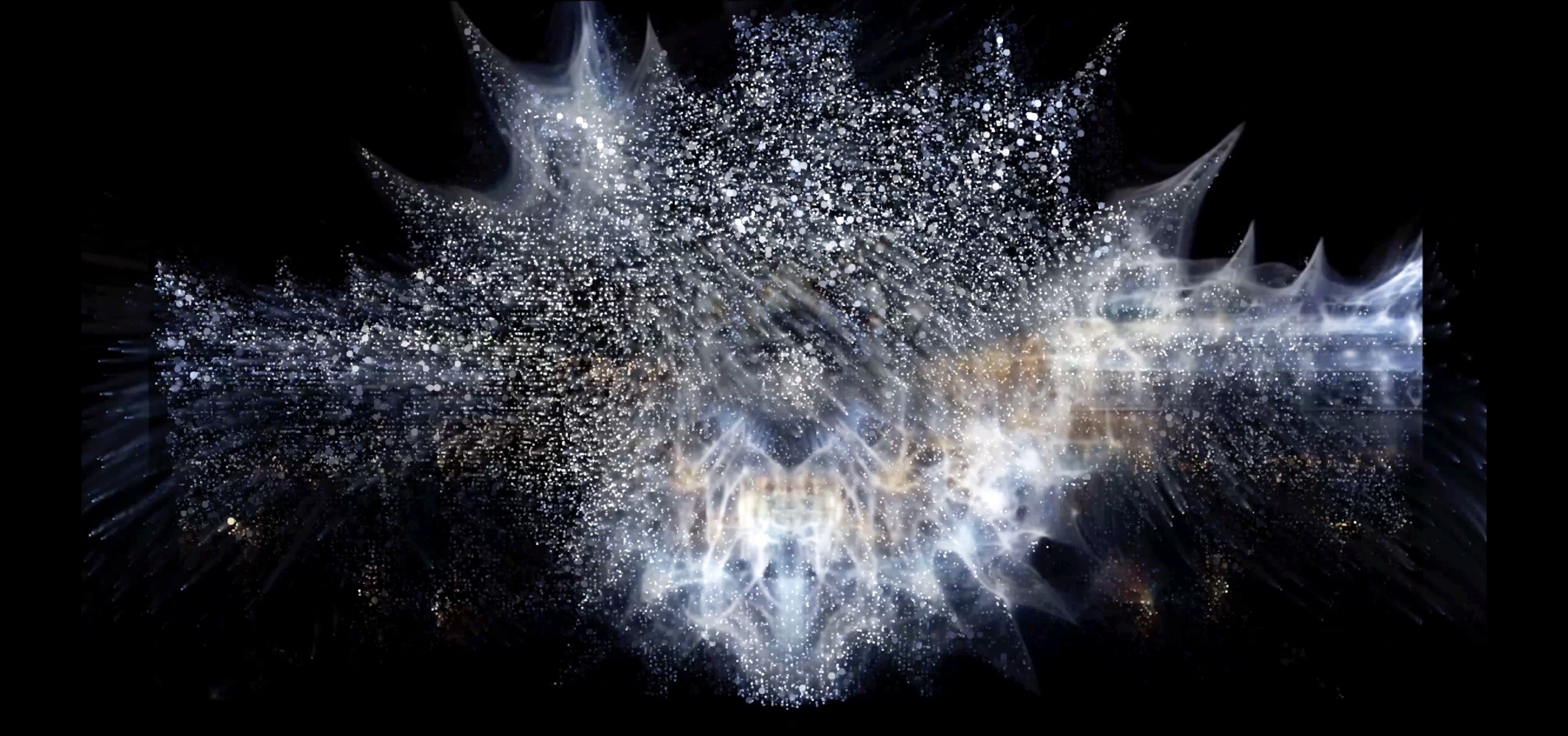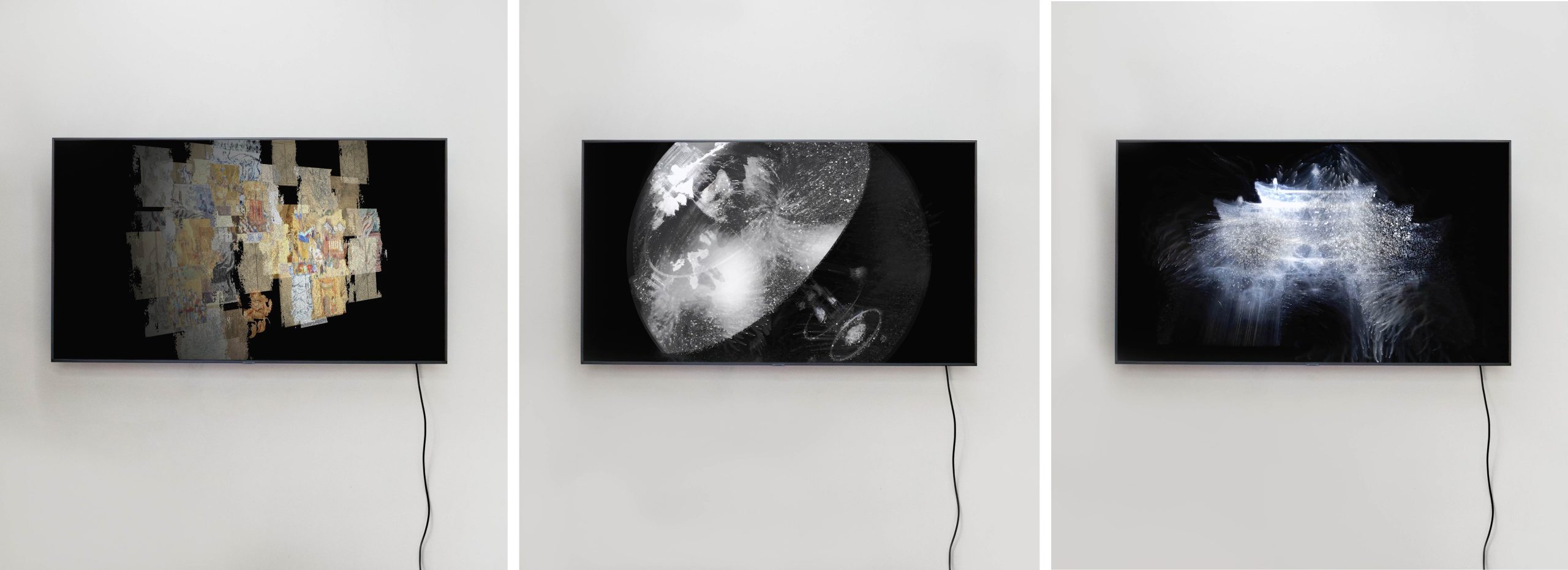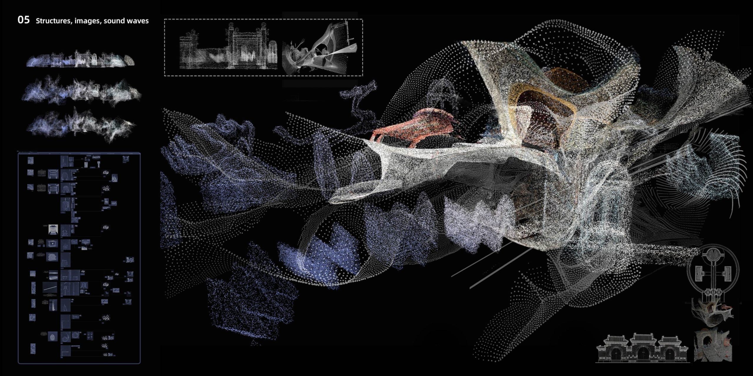 The triptych video consists of: (1) Visual archive: over a thousand layered cultural symbols evolving with ritual lyrics; (2) Ritual program controller: an interactive diagram of “sound-symbol-space” from a celestial perspective; (3) AI-generated audiovisual hallucinations: a particle system merging historical imagery and sonic fluctuations. Here, AI hallucinations are not flaws but emergent collective imaginaries—when deities and mythical beings carry multiple historical archetypes, their indeterminacy reconstructs the sacred as an unfixed epistemic threshold.