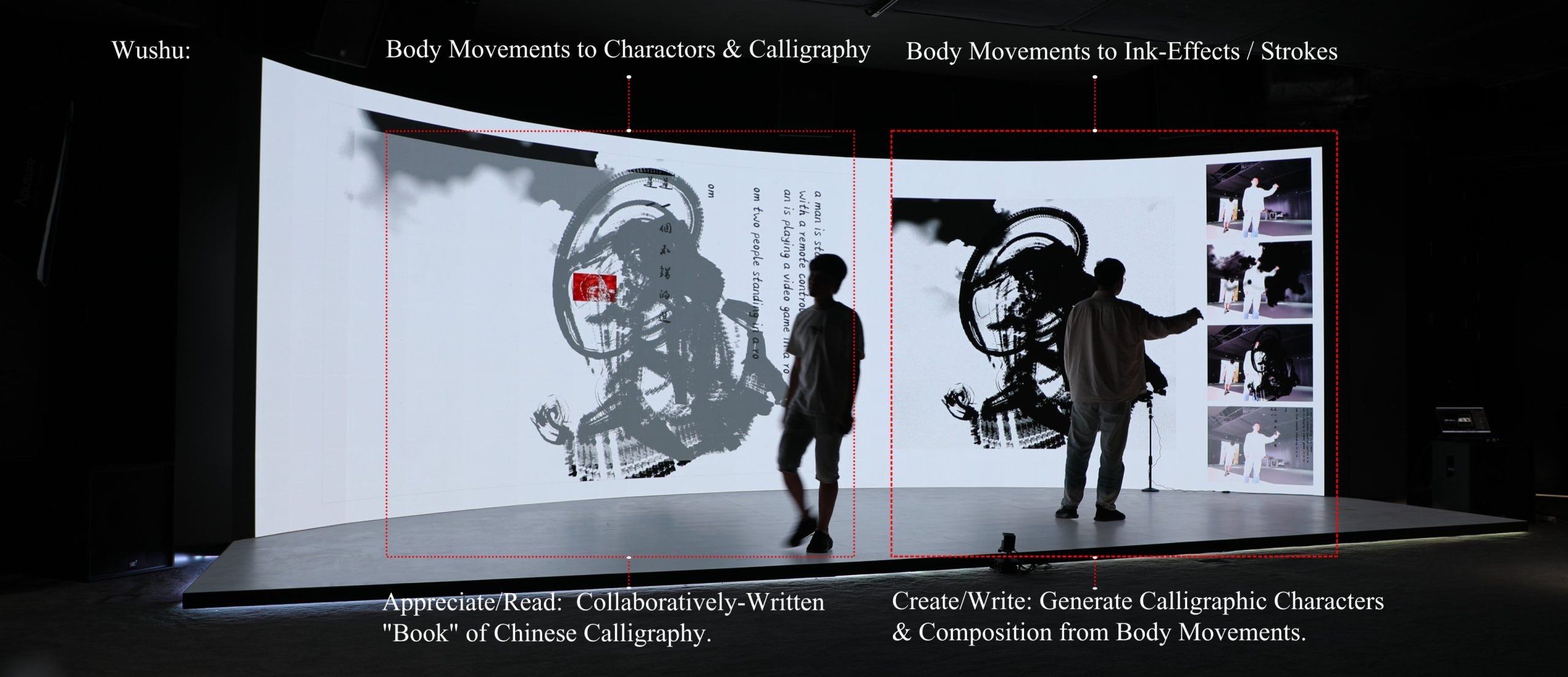 Wushu, 2023, is an endless collaborative book that intends to encourage and archive active participation in Calligraphy while extending its scope as an art form. This piece engages the audience in generating ink strokes and effects from their motion input. Two customized neural networks generate bilingual inscrutable characters from the audience’s engagements through a "Motion Caption" process. Procedural algorithms derived from calligraphy research and “Four Principles” manipulate the generated characters and their layout compositions, responding to the motion data, and automatically “write” them in the Chinese calligraphy genre. This offers the audience an accessible method to interact with the calligraphy, regardless of their previous knowledge of this oriental art.