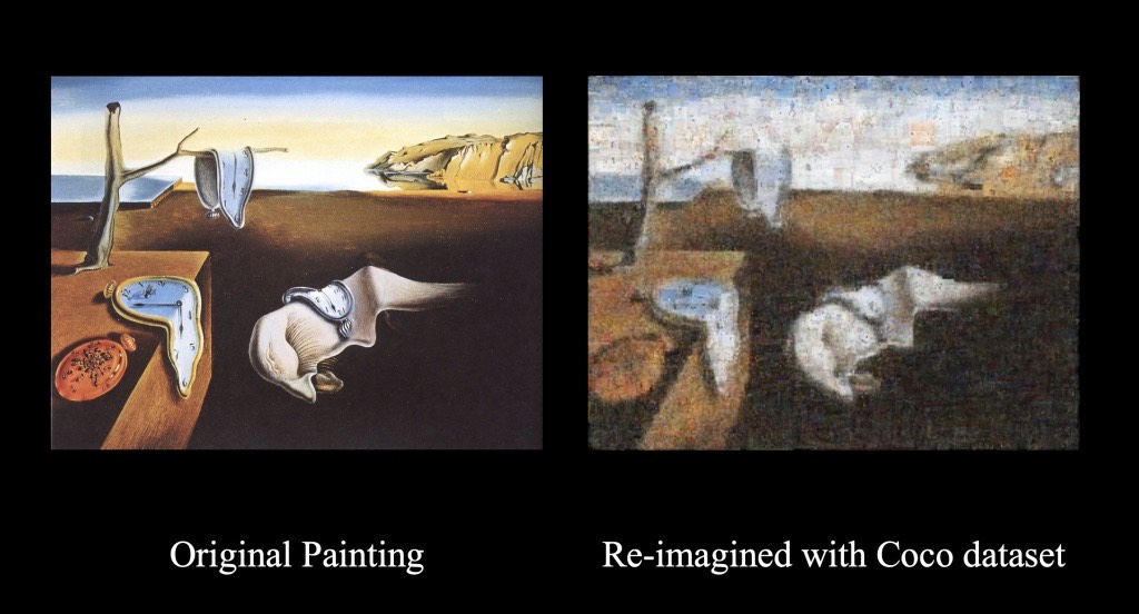 The piece juxtaposes two visual domains: the unremarkable and the magnificent. Utilizing the COCO dataset — a popular large-scale collection of practical, recognizable images for computer vision tasks — the everyday images are layered and recomposed, their patterns unfolding into visually compelling forms inspired by history’s greatest artists. Conversely, the sublime beauty of traditional art, sourced from the WikiArt dataset — a repository of artistic achievement across centuries — is dismantled and reassembled into pictures of everyday scenes, its essence molded into the textures of ordinary life.