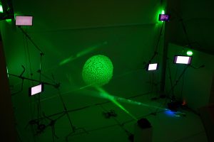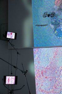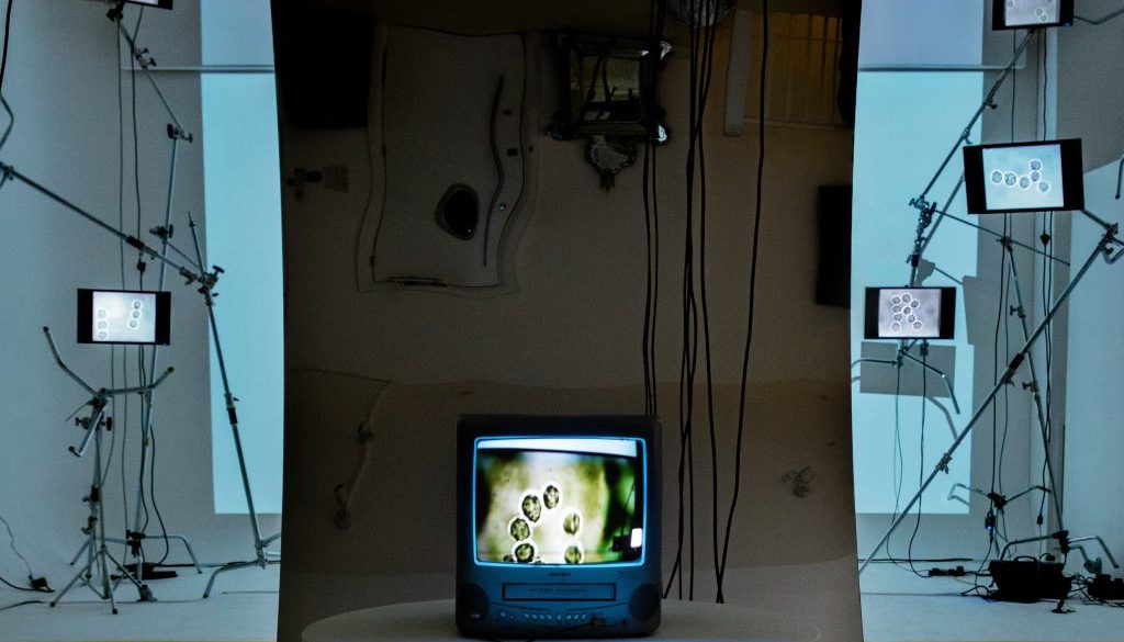The installation unfolds across five screens, a wall of projection, and a slide projector modified into a microscope that projects the actual specimens on the slides used under the optical tweezers, creating a meta-animation of its own process. A choreographed drone weaves through the space capturing a single, curated perspective of the work. This is broadcasted on a TV in the front gallery, where a large mirror sculpture obscures full view of the main space. Like the microscope that lets us peek into microscopic world, the drone’s eye becomes the only way to see inside the gallery – another mediated gaze, filtering reality through a particular perspective, shaping what can be seen and what remains hidden.