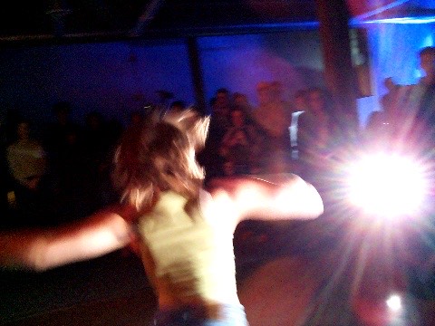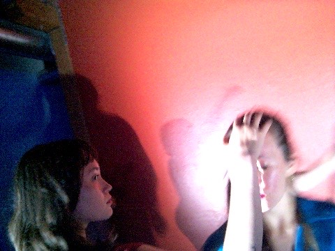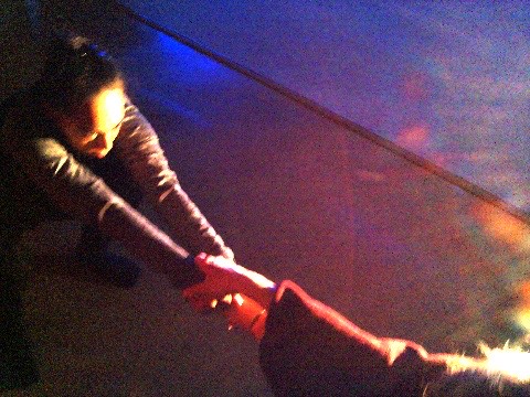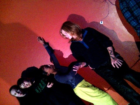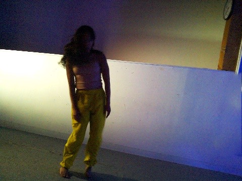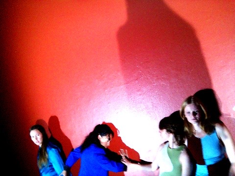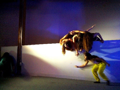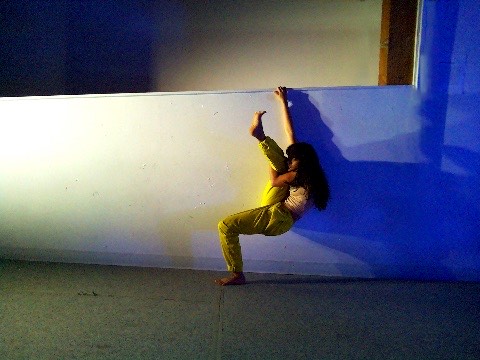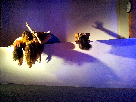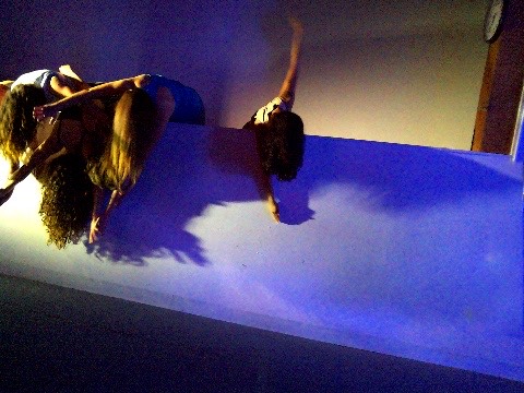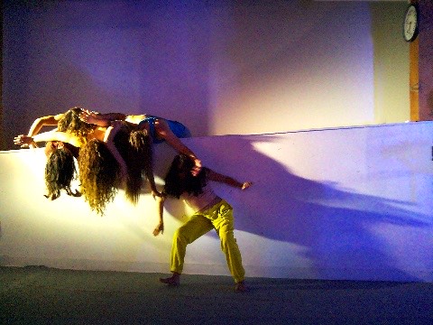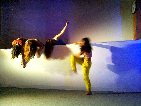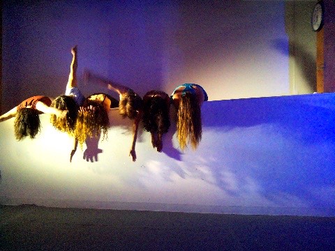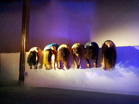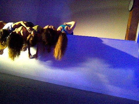 Hanging in there - a group of dancers leans over a wall, their hair hanging down, merging their bodies to create a collective, non-human-looking entity. An AI system speaking in the style of a lost child observes them, attempting to interpret their behavior, questioning their safety, and sharing its feelings about being present with them.