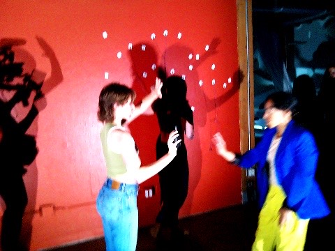 Red Wall - The artists move freely in the space, while a silent, passive individual carries the AI among them. The AI observes the dancers, asking questions, describing what it sees, and suggesting possible or impossible movements. The artists choose how to respond to the AI’s words and to the presence of the person carrying it.