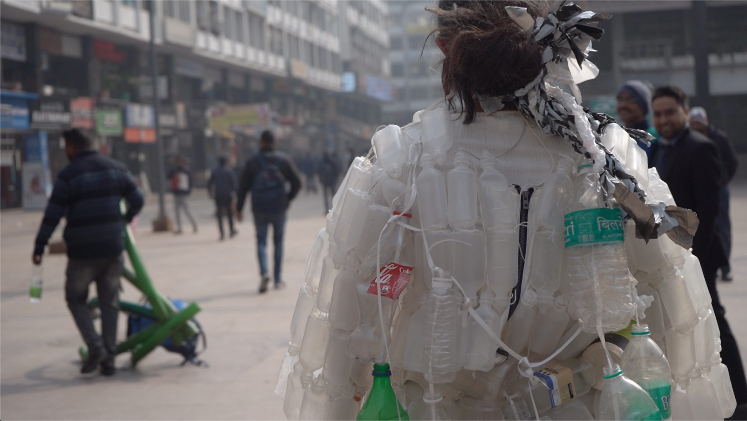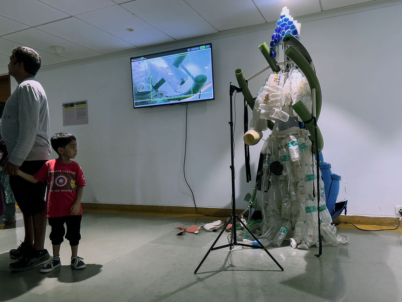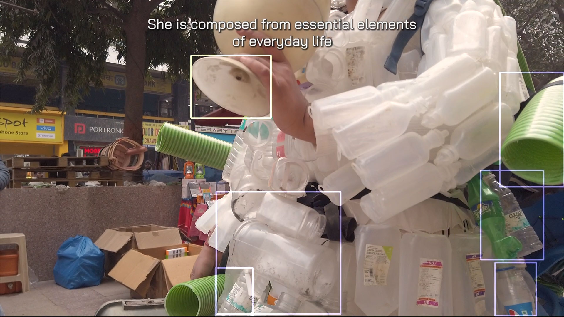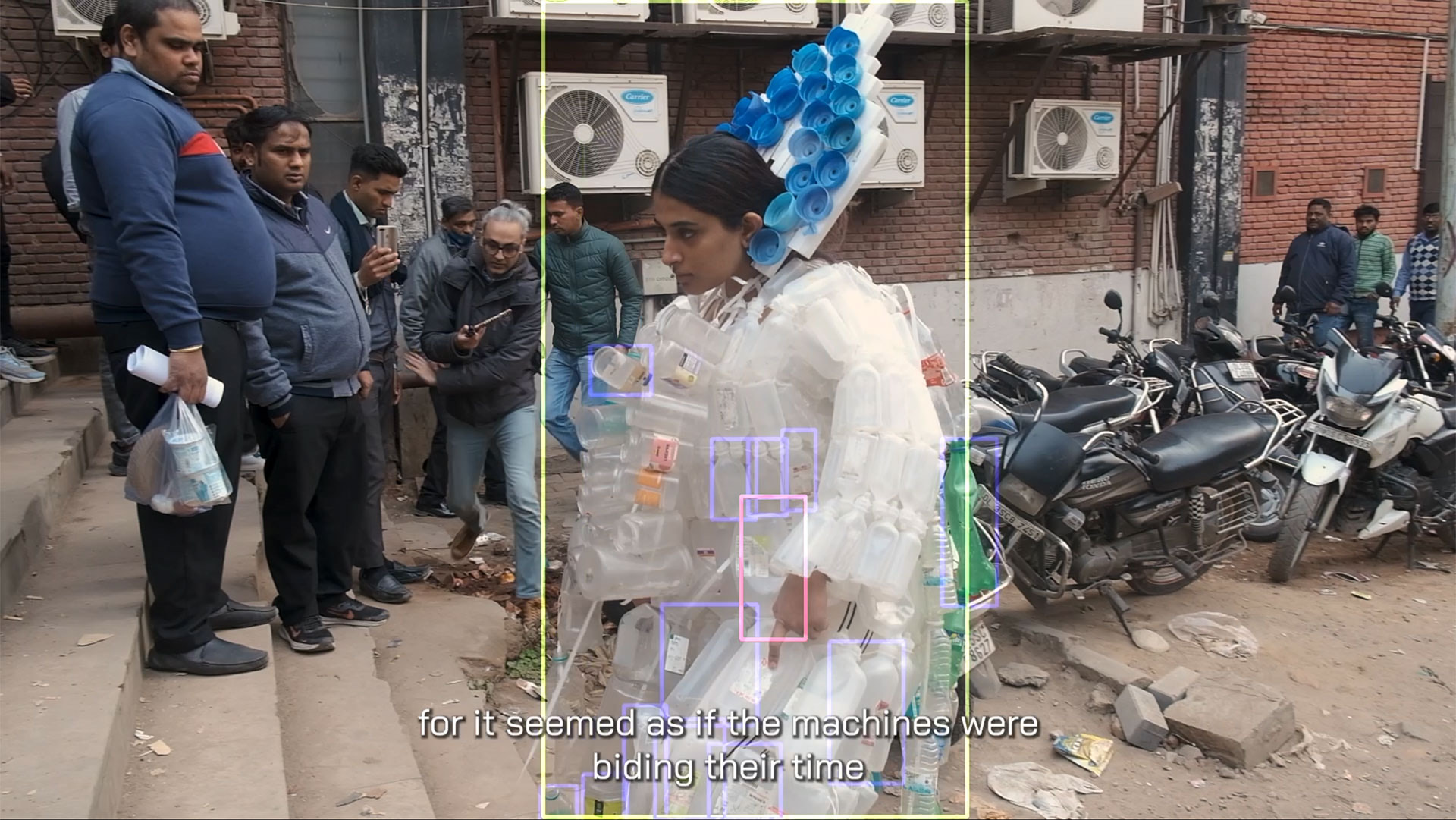 As part of the FutureFantastic exhibition in Bangalore, we created an interactive, live-camera installation to demonstrate the underlying principle of Poetics of Garbage. The displayed costume in the gallery was subject to the same object recognition algorithm but used a different language model—an RNN text generator—that was trained on the text corpus that was originally generated from the street performance. In effect, the live-camera installation performed an algorithmic remix of the Plastic Prāyaścitta narrative when a gallery visitor changed the position of the camera.