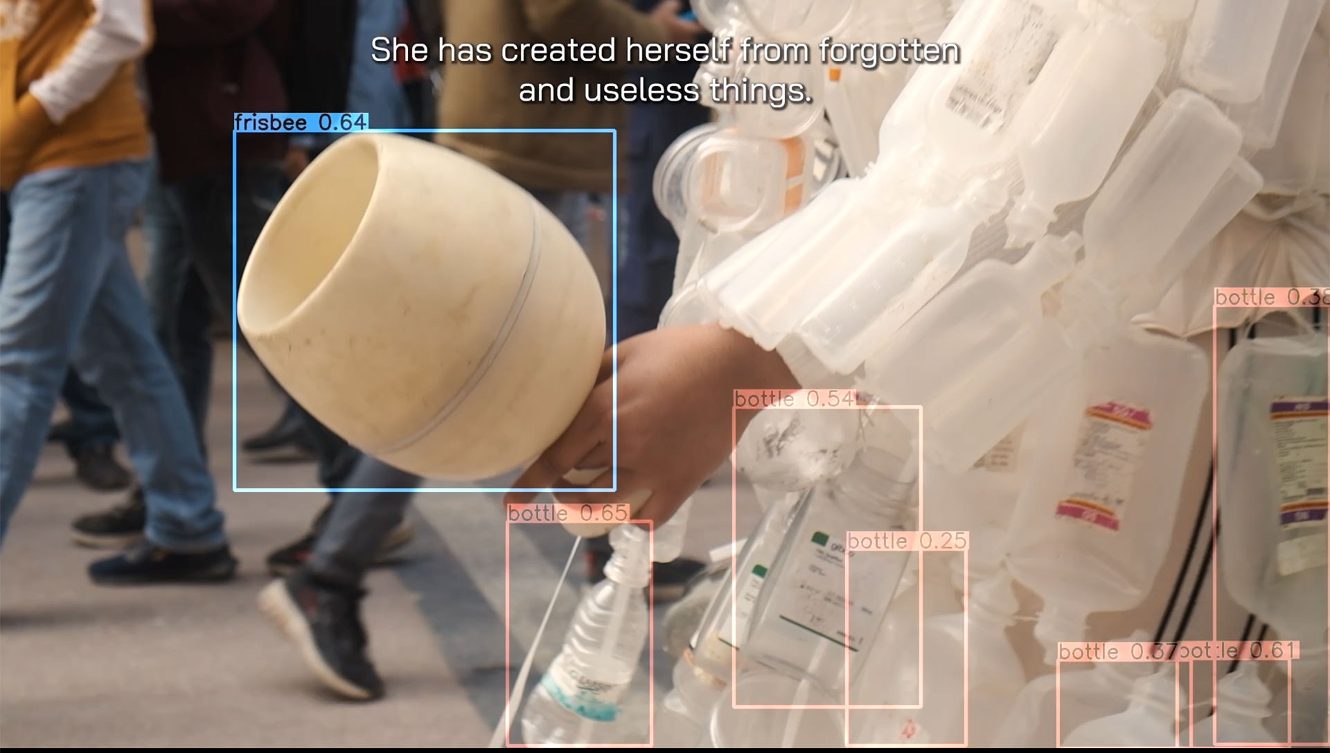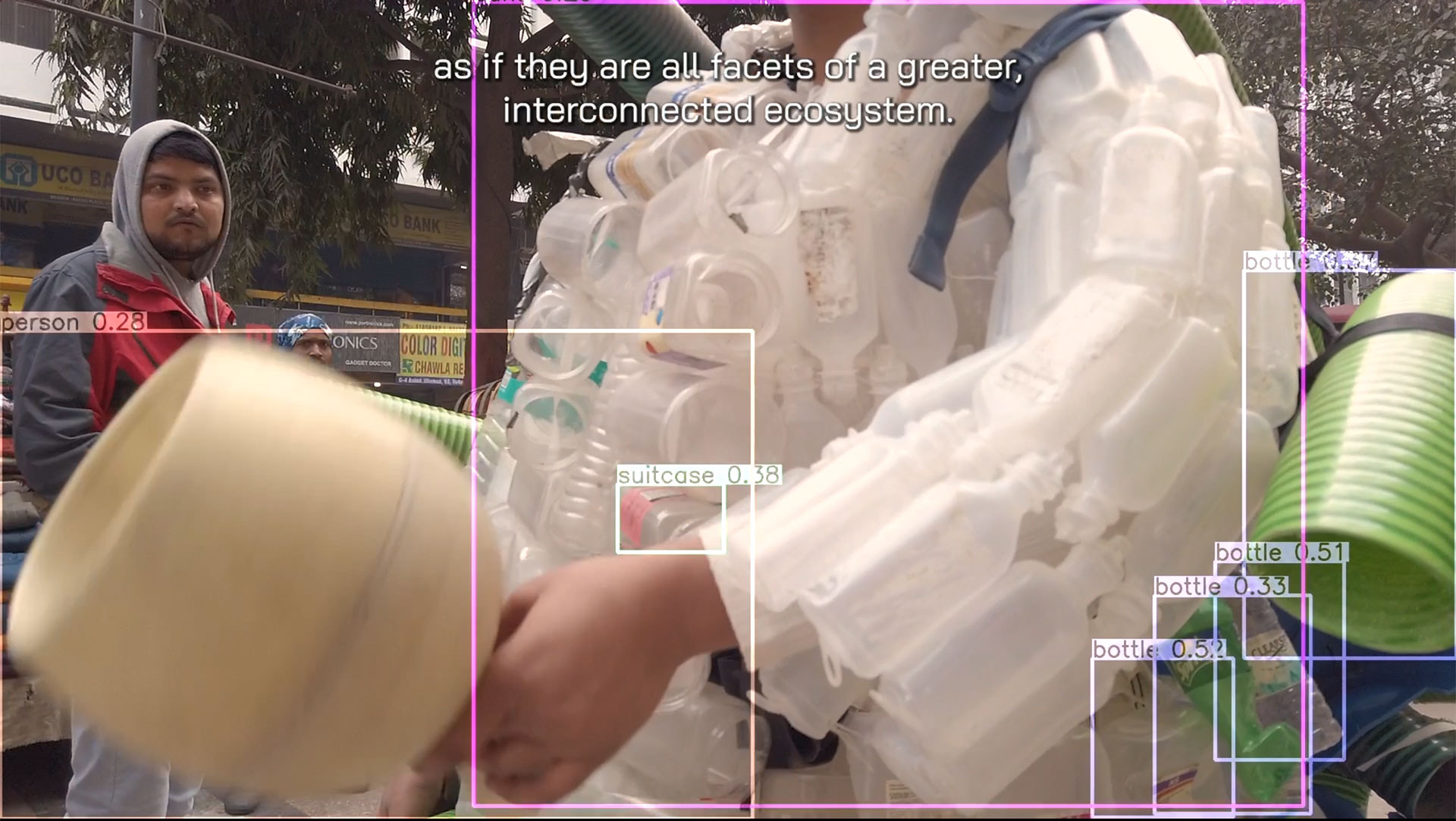 When moving, the shape of an object appears to change within the computer vision frame, often eliciting misclassifications, which we understand as part of a novel form of interaction and chance operation in art. The text labels produced by YOLOv7 object detection (including misclassifications) were incorporated into language prompts that were consequently ‘autocompleted’ by a language model (GPT-3) into a series of statements—a form of commentary that alludes to the picture in surprising and poetic ways. Iterations of these text outputs were curated, translated into Hindi and Tamil languages and narrated by an Indian voiceover artist as the soundtrack to the video.